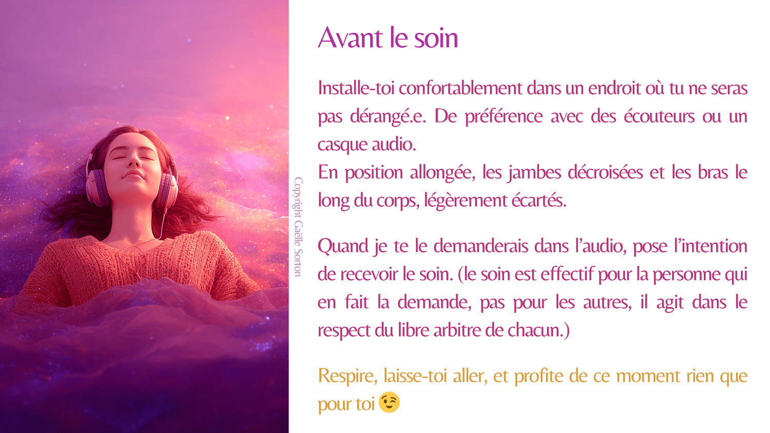 Tu peux te référer aux fiches de soins de chacun des audios pour en trouver un qui corresponde à tes besoins actuels.