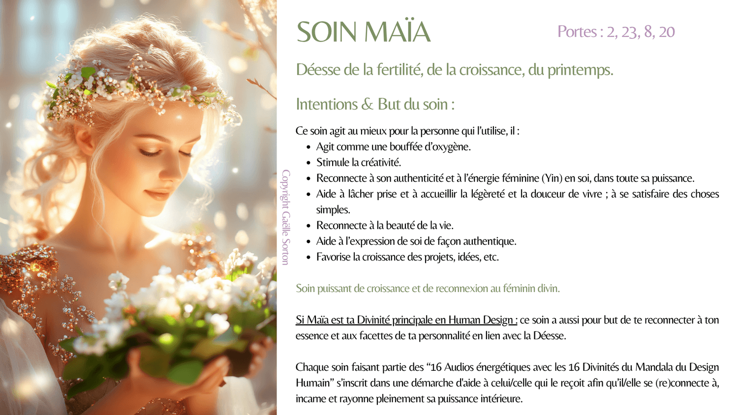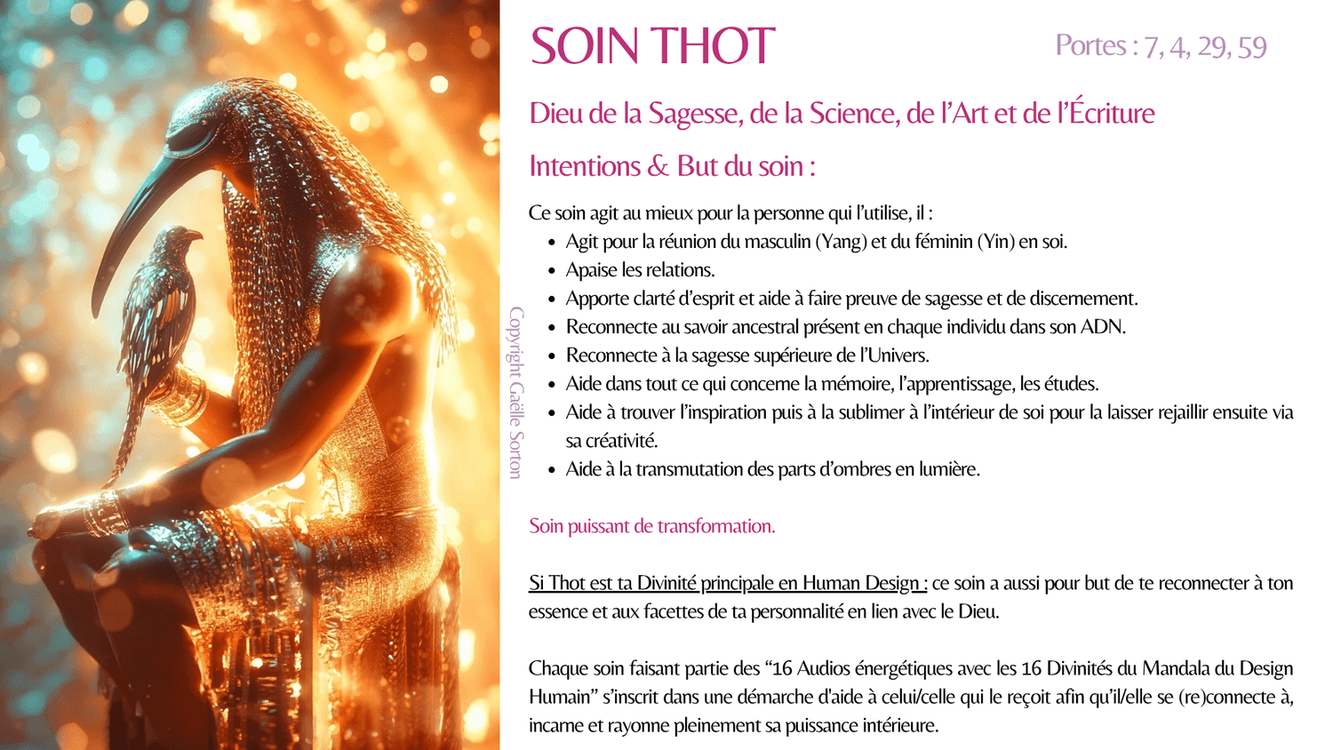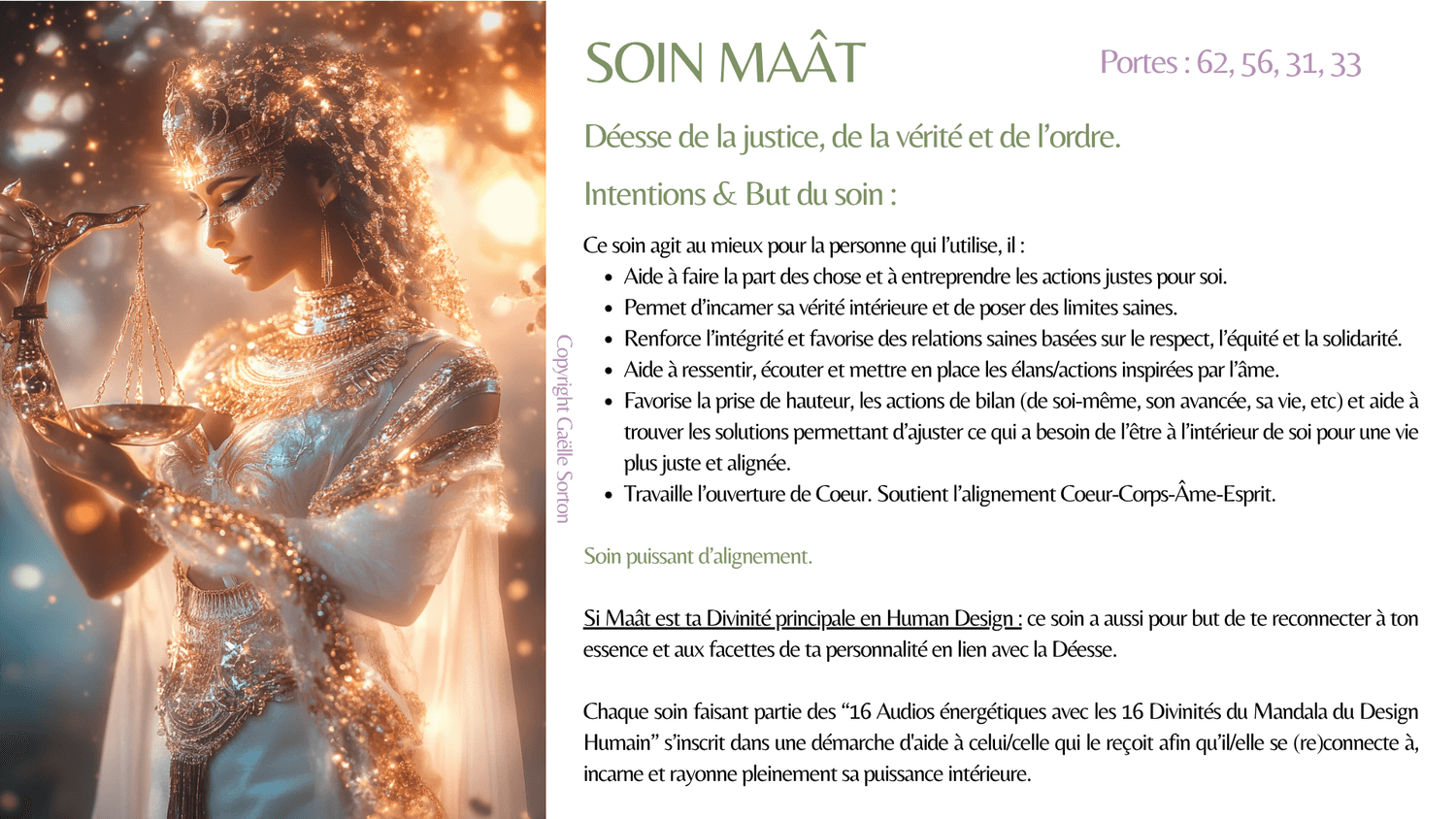 En plus des effets du soin, celui de ta Divinité principale a pour but de te reconnecter à ton essence et aux facettes de ta personnalité (forces) en lien avec elle.